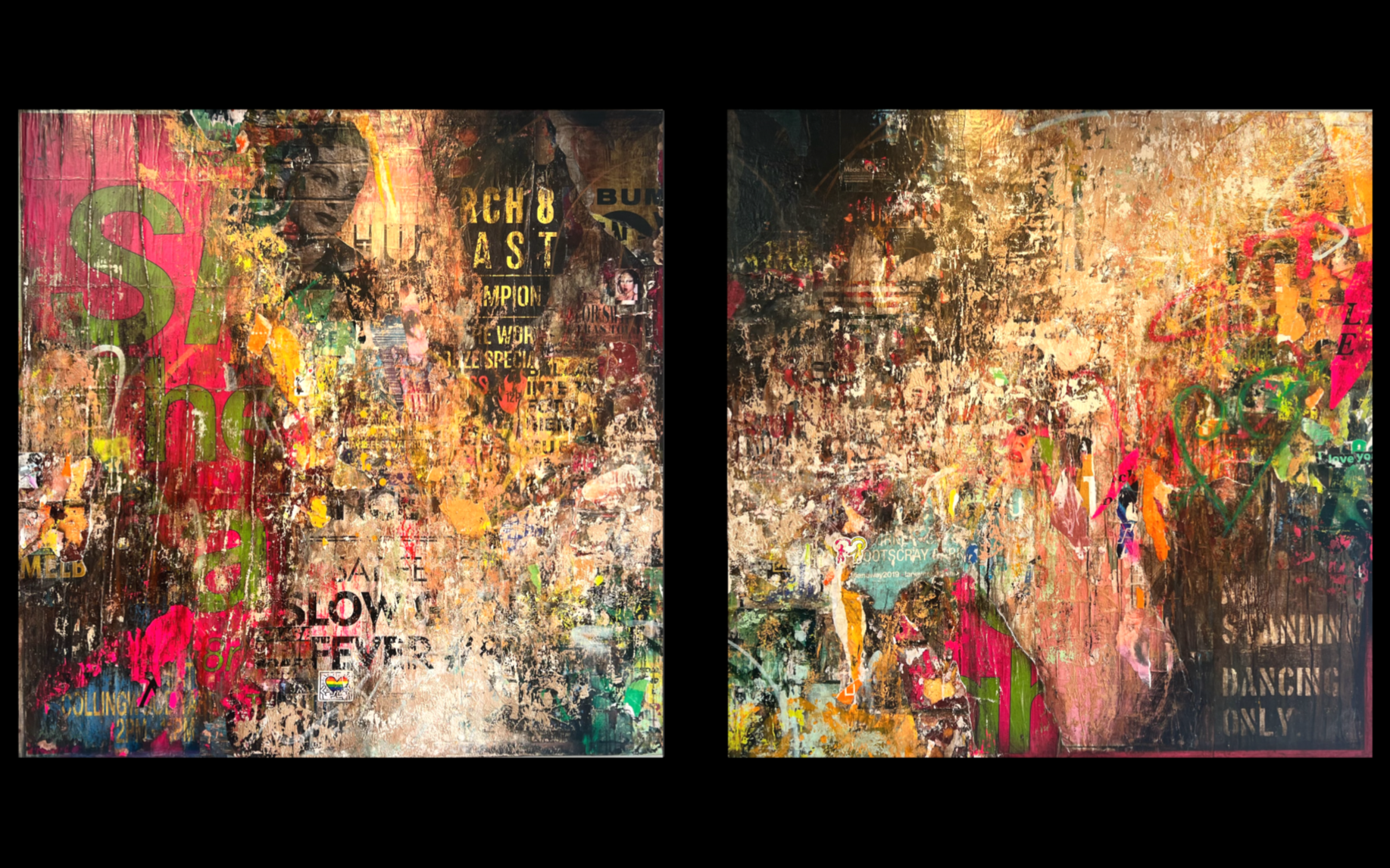 Medium: Torn street posters, & spray paints, paint pens, gloss varnish on board