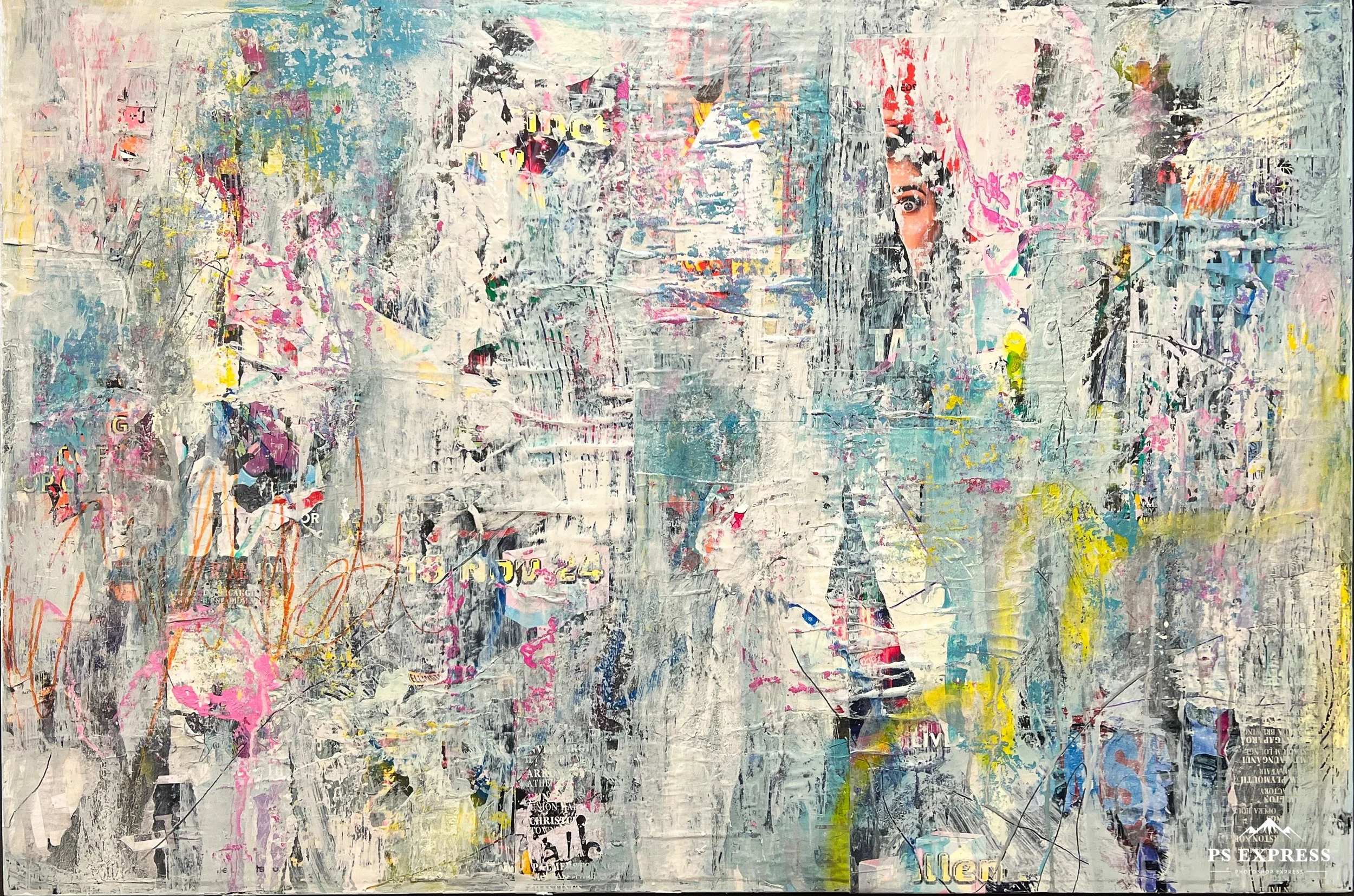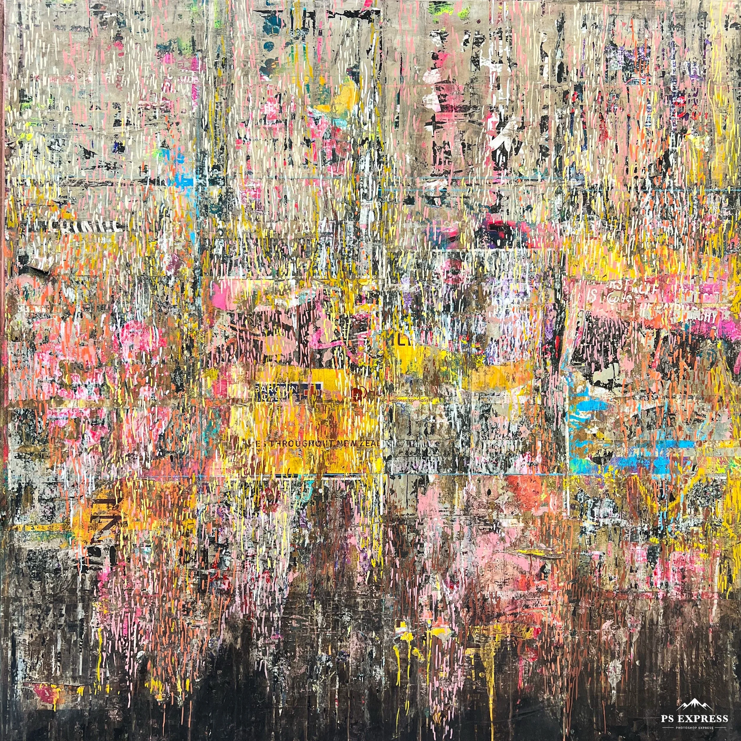 Medium: Torn street posters, spray paints, paint pens, gloss varnish on board